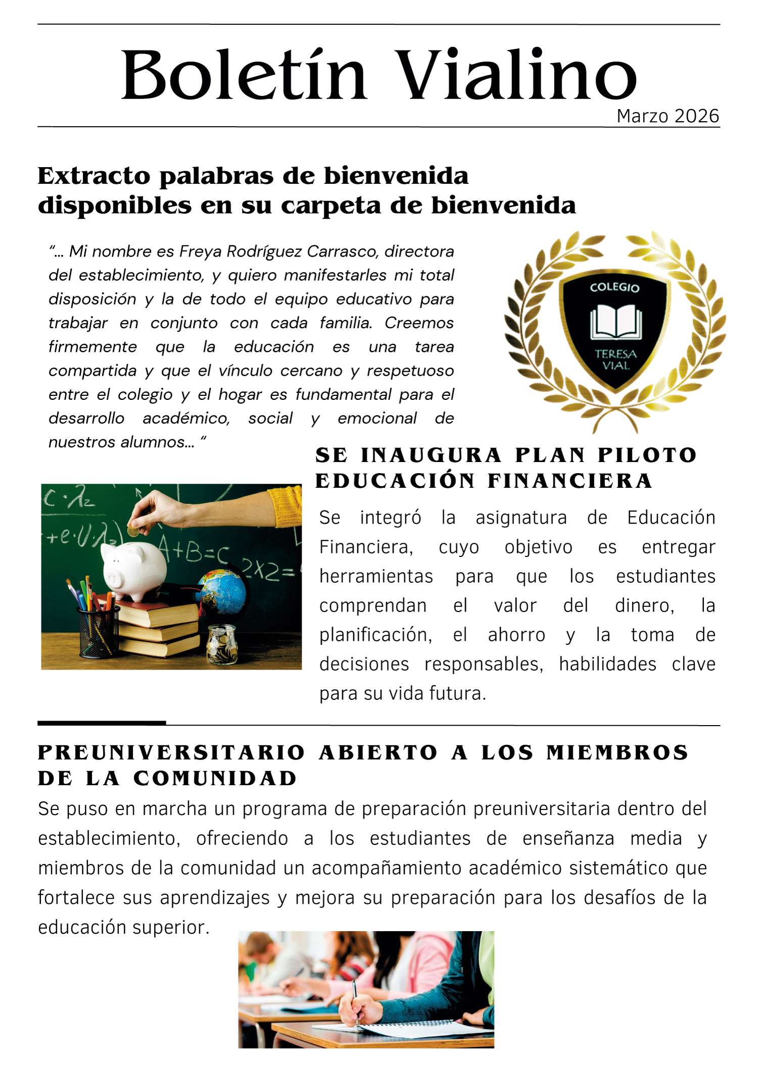 Descubre las noticias de este mes: Palabras de bienvenida, una nueva asignatura de Ed. Financiera, la puesta en marcha de un nuevo programa de Preuniversitario, entre otras excelentes noticias de interés para nuestra comunidad…